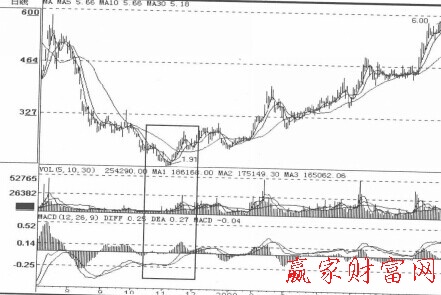 那么,同期的日線MACD怎樣呢?當分時MACD發出多頭信號后,日線MACD也在第三天向上發散,BAR紅柱產生并逐日增長,日線MACD與分時MACD形態差不多,且也在底部出現底背離走勢,5日均線與10日均線出現金叉信號,進一步明確60分鐘MACD和日線MACD多頭信號的可靠性。此后股價出現逐波向上運行,累計漲幅較大。