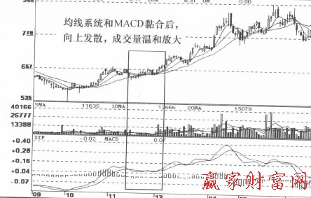 在日K線中,DIF線和MACD線穿過0軸后,由于莊家洗盤所致,DIF線和MACD線在0軸附近形成黏合狀態,不久DIF線向上發散,SAR紅柱產生并逐日增長,構成買入信號。移動平均線也形成黏合狀態,總體趨勢向上,均線堅挺有力。隨后向上發散,形成多頭排列,成交量溫和放大,買入信號清晰可見。此后,股價出現盤升走勢,行情延續一年多,累計漲幅巨大。