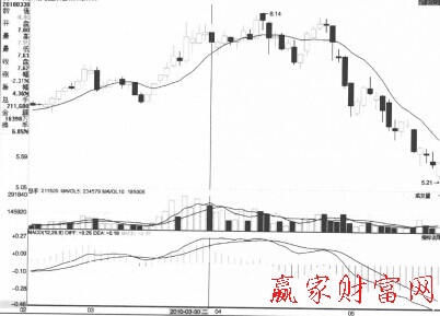 模塑科技(000700)于2010年3月16日開始上漲,MACD曲線也一直處于上漲狀態(tài)。3月30日,MACD值為+0.15,小于上一個交易日的MACD值,說明股價上漲已經(jīng)接近了尾聲,穩(wěn)健的投資者應(yīng)該在此時拋出籌碼。雖說在之后的交易中股價再次創(chuàng)出祈高8.14元,可是MACD指標中的紅色柱線比之前變得更短了,證明空方力量遠大于多方力量,激進的投資者應(yīng)該在此時應(yīng)果斷離場。此后該股一路下拉,跌至5月21日的5.21元,跌幅達30%。如圖所示。