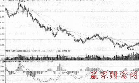 如圖所示為華夏銀行(600015) 2007年12月7日至2008年12月4日期間的走勢圖,此股在此期間處于下跌趨勢中,移動平均線呈空頭排列形態,即周期較短的移動平均線運行于周期相對較長的移動平均線下方,根據MACD指標的計算方法,我們可以知道此時MACD指標的計算結果應是負值,因而下跌趨勢中的MACD指標線在大多數時間內是位于0軸下方運行的,這就是MACD指標線對于下跌趨勢的直觀反映形式。