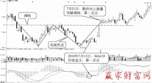 第二買點:DIFF線向上,股價突破雙底形態(tài)頸線。