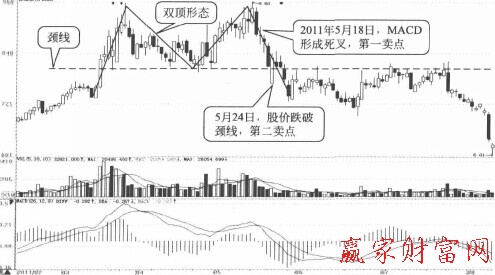第二賣點:股價和DIFF線同時向下,股價向下突破雙頂形態(tài)頸線。