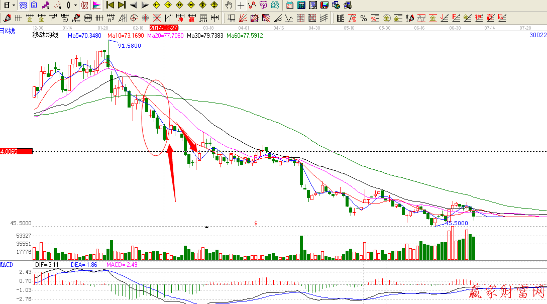 300228富瑞特裝屬于機(jī)械行業(yè)板塊、頁巖氣板塊,在市場(chǎng)中的前期創(chuàng)出高點(diǎn)之后,2014年2月28日拉起一根陽線,形成下降插入線。這一形態(tài)出現(xiàn)在連續(xù)陰跌之中,小陰線堆積K線形態(tài),大陽線收盤價(jià)必須插入上一交易日小陰線實(shí)體內(nèi)部,下降插入線形成當(dāng)天沒有成交量的配合,此為賣出信號(hào)。