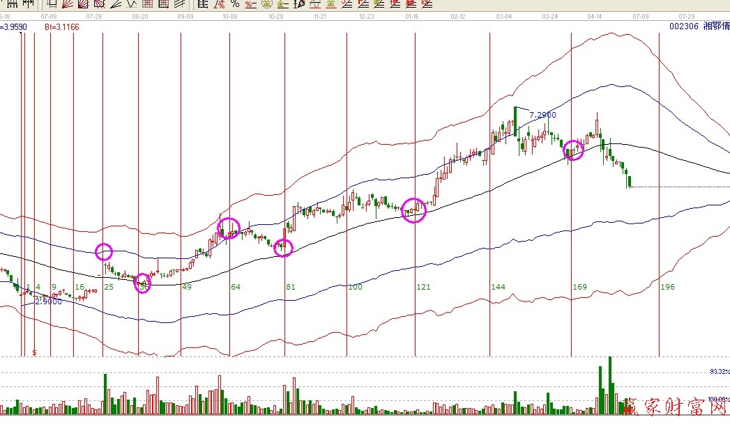 下面我們以002306來(lái)展示平方時(shí)間循環(huán)線在個(gè)股中的應(yīng)用。首先我們?cè)诠ぞ邫谥羞x出平方時(shí)間循環(huán)線,以2013年6月25日的低點(diǎn)2.90為起點(diǎn)畫平凡時(shí)間循環(huán)線,豎線為時(shí)間變盤點(diǎn),我們可以看到,每當(dāng)時(shí)間窗口出現(xiàn),往往會(huì)伴隨著趨勢(shì)的轉(zhuǎn)變,在圖中我們可以看到重要的買點(diǎn)和賣點(diǎn)都出現(xiàn)在時(shí)間變盤點(diǎn)。讓投資者更準(zhǔn)確的把握了買賣時(shí)機(jī)。