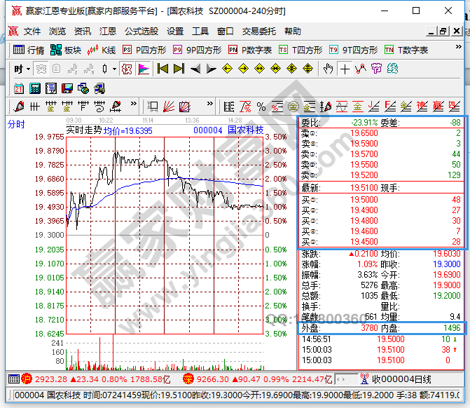 “內盤”:賣家以買①、買②、買③等價格賣出自己的股票成交時的數量,常用S(賣出的英文sell的首字母)表示,用綠色顯示,在中國股市綠色代表的就會與陰跌扯上關系,它反映著主動賣的意愿;“外盤”:買家以賣①、賣②、賣③等價格買入股票成交時的數量,常用B(買入的英文buy的首字母)表示,常用紅色顯示,在中國股市紅色代表的就會和陽漲扯上關系。“內盤”和“外盤”相加成為成交量。“內盤”的多少顯示了持股股民急于賣出的能量大小;而“外盤”的多少顯示了股民急于買入的能量大小。因此當外盤數量大于內盤數量時,股票將可能上漲;當外盤數量小于內盤時,股票將可能下跌。