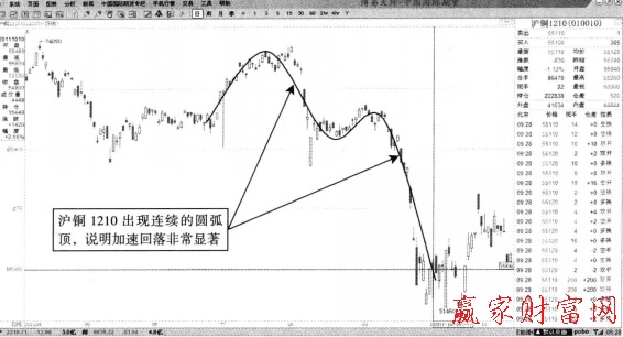 如圖所示,白糖1209合約出現的沖高回落的形態,兩次都是圓弧頂形態。圓弧頂形態的重要特征:價格回落的速度是逐漸加速的。到了期貨價格真正回落的階段,滬銅1209合約兒乎出現了跌停的情況。顯然,投資者如果在這個時候操作期貨合約的話,猶豫當中必然錯過做空獲利的機會或者喪失止損出局的好時機。