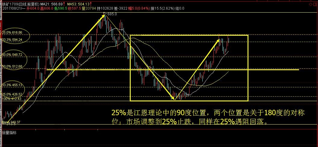 附圖:鐵礦1709行情走勢,市場的調整空間及反彈空間,趨勢交易,只在關鍵的位置進行操作: