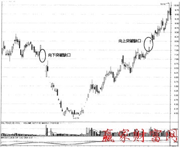 在成交密集的反轉(zhuǎn)或整理形態(tài)完成之后,股價(jià)突破阻力或跌破支撐時(shí)出現(xiàn)大幅度上漲或下跌所形成的缺口,稱(chēng)為突破缺口。突破缺口的出現(xiàn)一般視為股價(jià)正式突破的標(biāo)志。在股價(jià)向上突破時(shí),必帶有大成交量的配合。缺口越大,股價(jià)未來(lái)的變動(dòng)越劇烈。