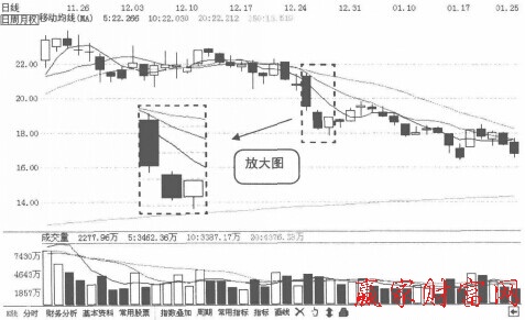(3)在下跌的第二天股價出現向下跳空,并收出一根陰線,第三天股價出現一定反彈,但幅度相當有限,最終收在前一根陰線缺口的下方附近。