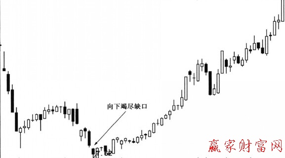5.向下跳空缺口出現(xiàn)的隨后一段時(shí)間里,如果股價(jià)K線的組合形態(tài)為雙重底、三重底、V形底和頭肩底等底部反轉(zhuǎn)形態(tài),更能確認(rèn)該缺口是向下竭盡缺口。