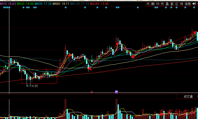 爐架底線是可靠性較強的見底信號,大陰線出現是股價在經過一段時間回抽之后,莊家洗盤所留下的痕跡。長陰線表示空方仍占優勢,隨后出現的小陰線和小陽線表明多空雙方開始激烈爭奪,此時莊家正在吸籌,中陽線報收是吸籌充分、拉升開始的信號。