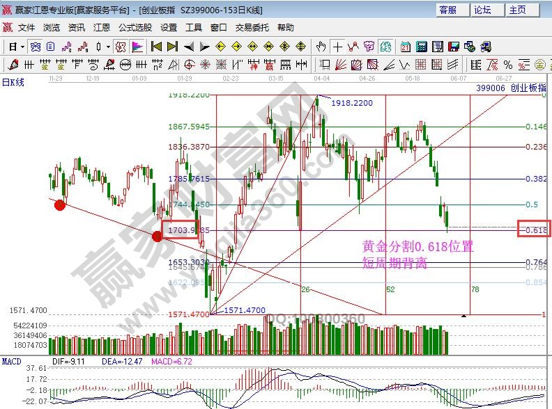 創業板連續調整9天,分鐘圖有超跌信號,日線黃金分割線0.618位置是1703點,根據極反通道物極必反原理,創業板指這里有下跌趨勢轉為橫盤震蕩,預期強則是震蕩反彈,時間窗口是12號,反抽過程中,應用好給大家講的周期關系,先看15分鐘生命線1730,再看30分鐘1750,然后是60分鐘生命線,逐級跟隨。