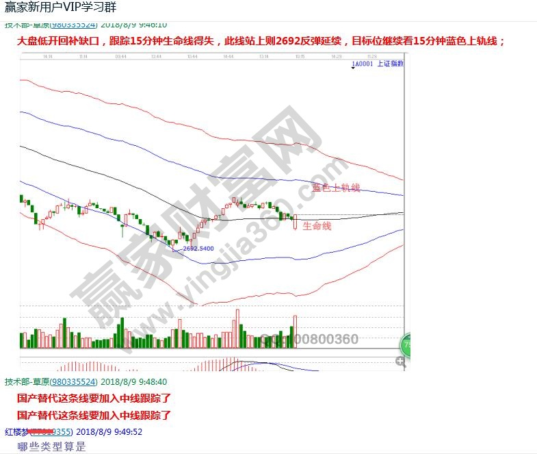 再談下大盤,一根中陽上去又將空間消耗了不少,短周期15分鐘同預期2692點反彈的目標位僅剩幾個點空間,休整后再度上碰藍色上軌線時按計劃7號參與的籌碼以獲利出局為主,休整期間回撤看30分鐘生命線,此線點位大致與日線百分比180度2772點相同。綜合結論為,2692點定性為反彈,而非反轉,操作以反彈策略應對,在不增加倉位的前提下,長線股通過差價降低成本,短線股則是投權為主不戀戰; 空間點位方面,15分鐘藍色上軌線及日線生命線、缺口位置2810-2845區間,支撐則看15、30分鐘和日線百分比180度對應的2770位置,下周是滬指周線時間窗,8月最后一周是上證50、創業板指時間窗。
