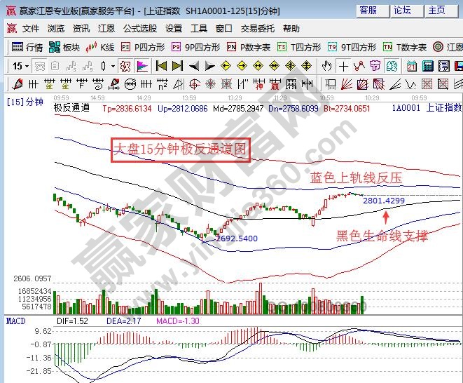 市場再次給做多投資者當頭一棒,低開全天一路走低單邊下跌,收盤正好落在短周期15分鐘極反通道生命線位置,此線是贏家江恩系統短線操盤參考線,市場在線上則具備操作機會,反之就是休息,2792點的弱反是否還能延續就是看此線得失,跟蹤周四早盤多空爭奪結果,收復則看高一線至藍色上軌線2790,失守則看低一線2690。