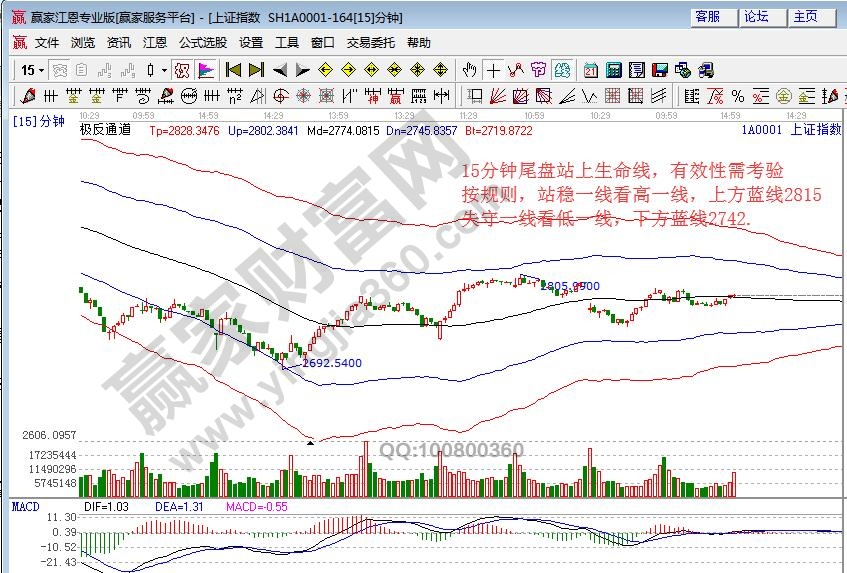 大盤(pán)2692點(diǎn)的反彈還未結(jié)束,判斷標(biāo)準(zhǔn)是贏家江恩極反15分鐘極反通道生命線得失,此線是短線操盤(pán)線,如同13號(hào)走勢(shì),盤(pán)中一直在線下震蕩,尾盤(pán)突破收在線上,此類(lèi)突破有效性需要次日確認(rèn),15號(hào)盤(pán)中看點(diǎn)依然是15分鐘生命線2776點(diǎn)得失,站穩(wěn)則看高一線,即藍(lán)色上軌線2815附近;失守則看低一線2742附近。15號(hào)下午第一根60分鐘K線是短期時(shí)間點(diǎn),有望揭曉是否延續(xù)反彈。