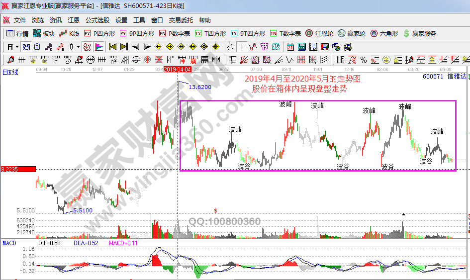 對照信雅達2019年4月至2020年5月的走勢圖去看,股價創出13.62的高點后回落至8元附近,之后1年的期間:走勢波谷波峰交替出現,股價在8元至13元的箱體內震蕩運行,沒有明顯的向上或向下,這種整體橫盤運行的態勢就是盤整趨勢。