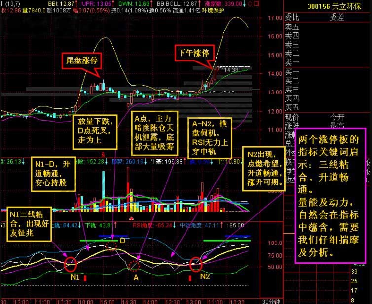 從RSI指標的角度,我們可以看到兩個漲停板的指標關鍵詞啟示,它就是:三線粘合、升道暢通。量能及動力,自然會在指標中蘊含,需要我們來進行仔細揣摩及分析。