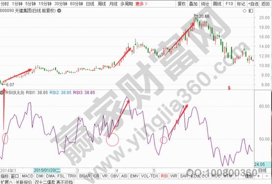 1、 股票呈現(xiàn)多頭趨勢(shì)的話,RSI突破50值就是買(mǎi)點(diǎn)。如果是賺了的話,就可以逢高離場(chǎng),如果賺了錢(qián)沒(méi)有離場(chǎng)的話,一旦RSI跌破50值那么就是賣(mài)出點(diǎn)位。如下面的天健集團(tuán)走勢(shì)圖。