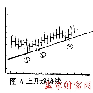 上升趨勢線的畫法就是把兩個(gè)或兩個(gè)以上的匯價(jià)最低點(diǎn)連接起來,所形成的直線。如圖A所示,把圖中如圖A所示,把圖中①②③點(diǎn)(最低匯價(jià)點(diǎn))連接起來就成為上升趨勢線,由于該直線上有三點(diǎn),故又稱為上升三點(diǎn)趨勢線,有時(shí)這條線上的點(diǎn)不止三個(gè)。如果落在上升趨勢線上的點(diǎn)越多,說明匯價(jià)的上升趨勢越明顯,因而其可靠程度也就越高。