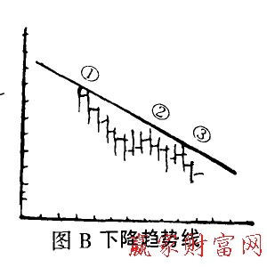 下降趨勢線,其畫法是把兩個(gè)或兩個(gè)以上的匯價(jià)最高點(diǎn)連接起來形成的直線。如圖B所示。把圖中的匯價(jià)最高點(diǎn)①②③連接起來就形成下降趨勢線。由于這條線上共有三個(gè)匯價(jià)最高點(diǎn),故又稱為下降三點(diǎn)趨勢線。與上升趨勢線相同,如果落在這條直線上的點(diǎn)越多,說明匯價(jià)的下降趨勢就越明顯,因而其可靠程度也就越高。從圖B中可以看出,連接①②③所形成的直線把全部匯價(jià)都壓在這條直線的下方,那高高低低的匯價(jià),猶如下跌的波浪,一浪比一浪低。它在試圖上升時(shí),無論怎樣上升,上升到①②③點(diǎn)之后,總是沖不破這條直線,而且匯價(jià)越躍起低,這條直線把所有上升的匯價(jià)都壓在其下,阻止匯價(jià)反彈上升,故此線又稱匯價(jià)上升阻力線。