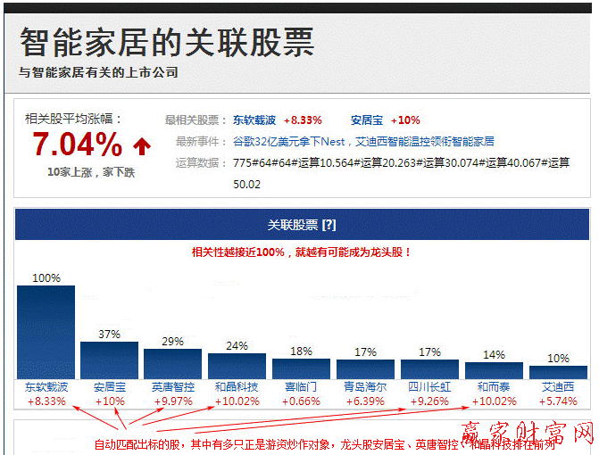 舉個例子,前段時間很火的智能家居概念。搜索相關概念,系統選出各個關聯股,由于系統是按照相關性自然排名,排名越靠前說明這個上市公司與“關鍵字”有越多的“故事”,應該重點留意。一般情況下,龍頭股(也就是有漲停潛力的)都會排在前5位,前3位大多數情況會出現至少一只能漲停的龍頭。