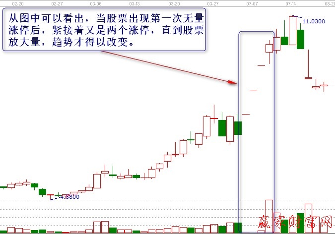一般情況下,無量漲停,意味著股票非常強勢,無量跌停,則意味著股票趨勢很弱。在我國的現行制度下,股票上漲下跌的幅度單日不能超過10%。因此,在股價第一次出現無量漲停時,其后面的趨勢會延續,會繼續漲停,直到有大量獲利資金流出股價才會結束該趨勢。同樣,如果股價第一次出現無量跌停,那么后市將會繼續跌停的趨勢,直到出現大量資金買入,才會出現趨勢的改變。
