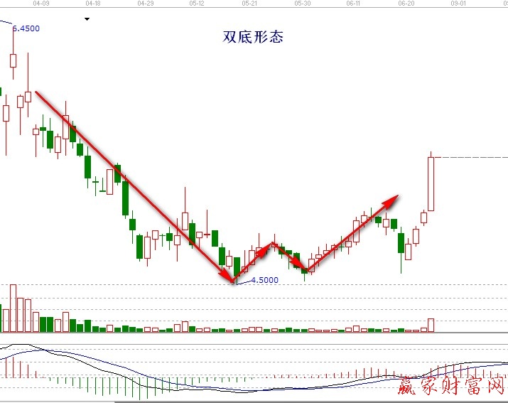 該形態一般多出現在股價經過一段時間的回調,股價見底開始反彈之際,因此,具有很高的實戰價值。在股票經過長時間回調后,成交量也一直縮量形成谷底,股價開始出現反彈,但是在隨后的行情中,成交量并沒有隨著價格一樣上漲。由于沒有量的支撐,股價再次回踩前期谷底位置,一般第二個谷底要高于第一個,形成雙底形態,意味著股價下跌缺乏動力,新的上漲行情即將開啟,投資者可以適當介入。