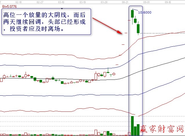 股價經過一段時間的上漲,運行到高價區,有時候出現一根大的陰線,如果其后的兩個陽線不能吞沒,則意味著股價頭部形成,應及時清場。另外,警惕出現過成交量的K線。因為很容易是頭部形成的標志。