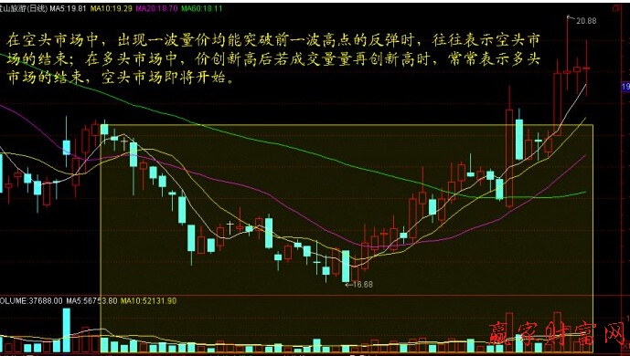 在空頭行情中,如果出現一波量價都能突破前一個波段的高點時,預示著空頭行情的結束;如果是在多頭行情中,股價在創出新高的同時,成交量也創出新高,預示著股票多頭市場將要結束。
