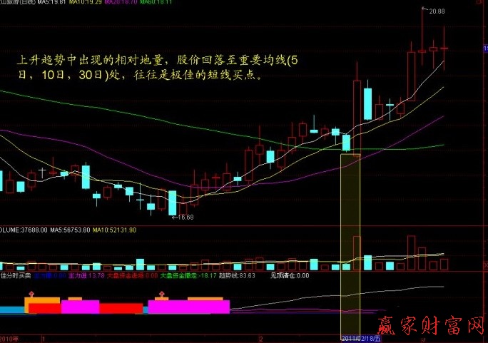 在上漲過程中,如果出現相對地量,股價也回調至重要均線的支撐位置,是非常好的一個買點。