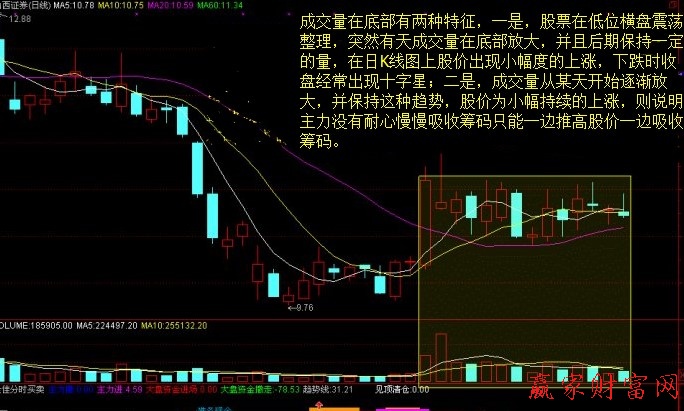 成交量在底部有兩種特征,一是,股票在低位橫盤震蕩整理,突然有天成交量在底部放大,并且后期保持一定的量,在日K線圖上股價出現小幅度的上漲,下跌時收盤經常出現十字星;二是,成交量從某天開始逐漸放大,并保持這種趨勢,股價為小幅持續的上漲,則說明主力沒有耐心慢慢吸收籌碼只能一邊推高股價一邊吸收籌碼。