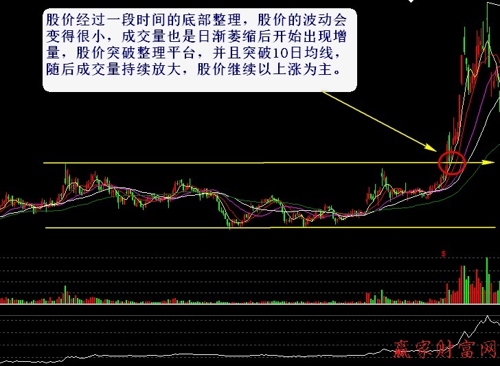 股價經過一段時間的底部整理,股價的波動會變得很小,成交量也是日漸萎縮后開始出現增量,股價突破整理平臺,并且突破10日均線,隨后成交量持續放大,股價繼續以上漲為主。