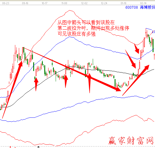 單純從K線判斷,一般強莊股多表現為紅多綠少,這表明漲的時間多于跌的時間,陽K線的實體大于陰K線的實體,莊家做多的欲望較強,市場的跟風人氣也比較旺盛。可以經常性的觀察到,個股在上漲的時候力度比較大,在漲幅的的前列常??吹剿挠白?而下跌的時候幅度卻遠遠小于其它的個股,并且成交量高于盤中個股的一般水平。
