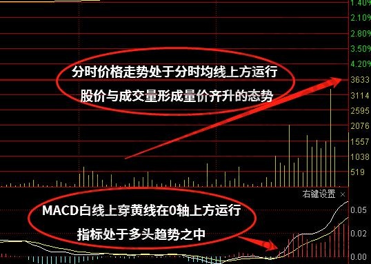 分時指標,投資者可以通過觀察之后,看看分時指標的形態,做個交易參考。如果說,在分時均線上方運行,非常穩定,因為均線本身是有支撐作用的,加上股票分時成交量在上升。同時,DEA(黃線)、DIFF(白線)在0軸以上,紅柱多頭趨勢之中,這種情況就表示,該只股票的尾盤所處的趨勢多頭,相對活躍。在第二個交易日大概率會延續上一個交易日的上升活躍走勢,投資者可以作為短線買點信號。