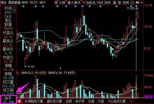 我們以同花順股票軟件為例:首先輸入自己要找的股票代碼或者股票簡稱(這里以“西安旅游000610”為例),查找到股票之后在周期中選擇周線,之后直接在股票k線上找到你想要的日期,k線圖的最左邊就會顯示換手率,或者直接點擊這一周的股票實體,也會顯示換手率。