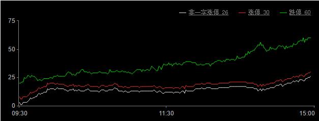 今日漲停家數30家(不包括ST股27家),跌停60家。創一年收盤新高個股有58家,新低個股有324家。市場極少個連板股強勢股未能吸引活躍資金,跌幅7%以上的個股近百家,交投情緒低迷,賺錢效應差。