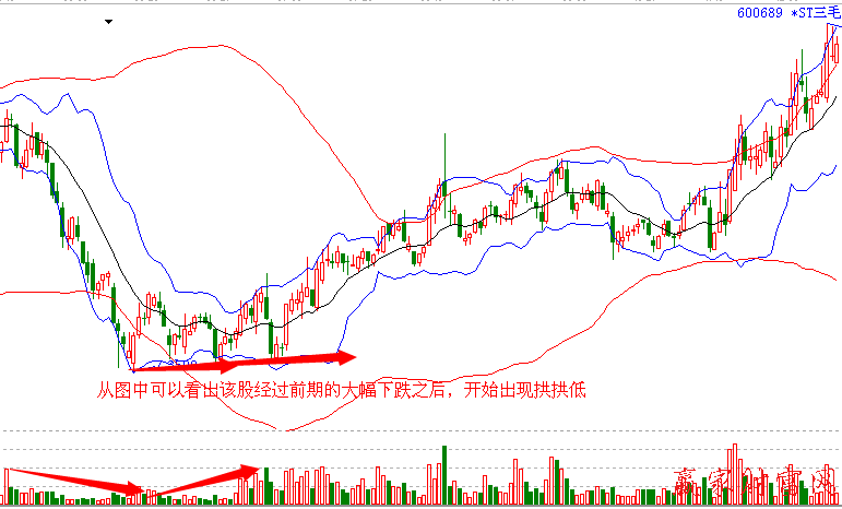從成交量來分析這個股可以看出,該股該股經(jīng)過快速殺跌之后,開始縮量整理,而且在底部有反彈的跡象出現(xiàn),在結(jié)合圖中的布林線可以看出,該在底部附近三次觸及布林線的低軌,然后開始大幅反彈。