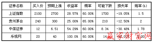 比如上證指數最高可能會達到2700點,達到這個點位的概率是60%。上證指數也可能下降到1700點,發生的概率為40%。貴州茅臺是典型的白馬股,基本上獨立于大盤走勢,根據該股的歷史走勢,確定該股在未來一年里會上漲到300元上方,收益率有25%。中信證券基本與大盤同步,但具有放大作用,對比該股與上證指數之間的漲跌關系,在大盤上漲過程中,該股上漲幅度是大盤的1.9倍。在大盤下跌時,該股下跌幅度是上證指數的1.6倍。