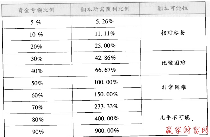 下面筆者列舉一個(gè)圖表,將虧損比例與翻本所需獲利比例做了一個(gè)對(duì)比如下: