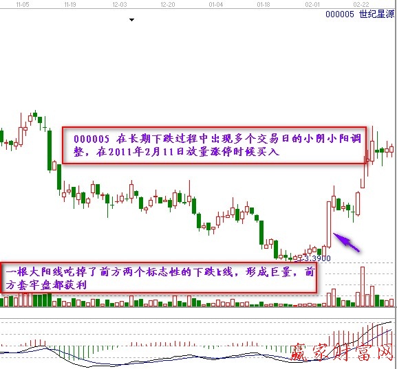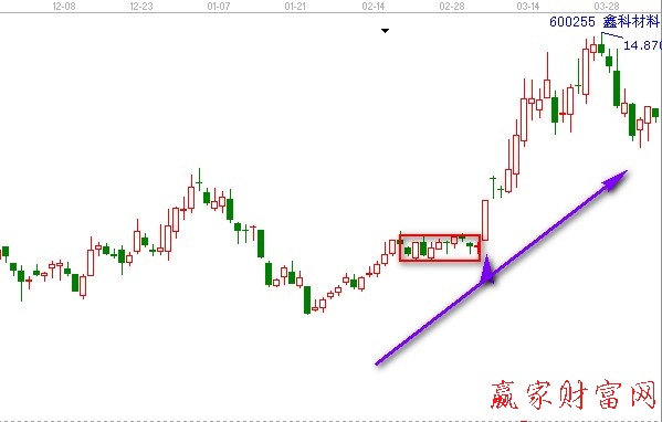在底部形成多個交易日的小陰小陽的調整,調整時間越久,上升空間越大。某一天出現大陽線時追入。