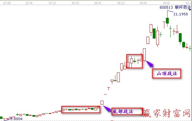 比如聯環藥業(600513)在 2010年8月13日底部戰法 在9月1日山頂戰法,底部追漲可以結合MACD量柱或者均線多頭更能提高成功率。