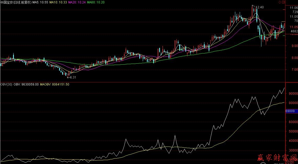當0BV指標向上拉升并脫離0-20%的區域時,說明此時主力已經吸籌完畢,股價進入拉升階段,此時成交量持續放大,只要OBV曲線與股價同步上升,則投資者可大膽追漲買入。