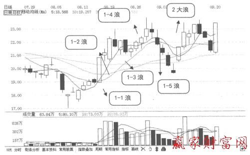 在把握兩者的過渡時另外還可以運用一點波浪理論或者重要支撐壓力位的知識來綜合判斷以提高準確率,以波浪理論為例,通常上漲浪為五浪,而下跌浪為三浪,盡管目前數浪方法各有不同,但往往運用起來還是有一定輔助作用的。