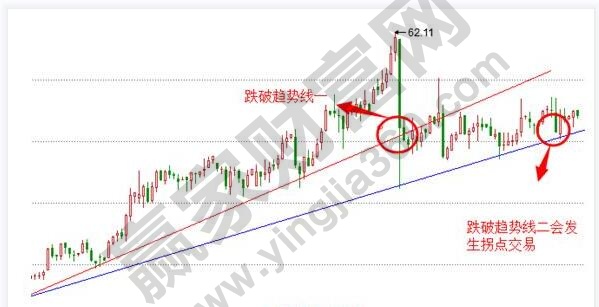 這種方法有兩種情況,一種是上漲過(guò)程中,可以將相鄰的兩個(gè)低點(diǎn)連接,形成趨勢(shì)線,如果過(guò)快上漲,乖離率變化,那么回調(diào)的幾率會(huì)出現(xiàn),這時(shí)候,價(jià)格可能跌破我們畫(huà)的趨勢(shì)線。如果說(shuō)多頭動(dòng)能再次向上反彈,沒(méi)有衰竭,那么就是震蕩行情,可能形成趨勢(shì)線二。