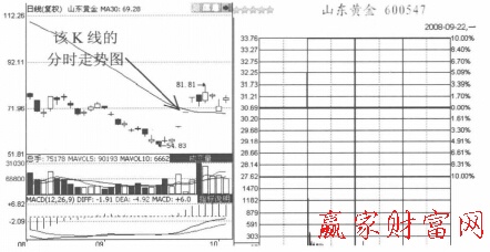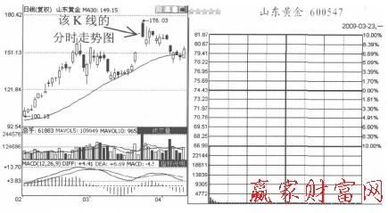 如果股價經過大幅拉升后,又出現一字型漲停,很可能是主力拉升己基本到位,然后第二天高開進行出貨。圖2是山東黃金(600547)的日K線圖和分時走勢圖。該股股價在不到4個月的時間內上漲了3倍,主力已獲利豐厚,這時就連續兩個漲停,然后就開始高開出貨,出貨那天出現一根大陰線。
