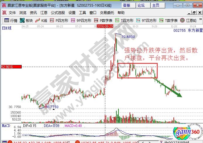 第二種出貨板,最近市場(chǎng)溫州幫操作的股票都成了妖股,做盤手法犀利,低部吃貨夠后,利用資金優(yōu)勢(shì)造勢(shì)吸引市場(chǎng)眼球,然后以跌停板方式出貨,連續(xù)兩三個(gè)跌停,往往給散戶以為買到便宜貨,其實(shí)主力的成本更低,一個(gè)反彈順利出貨。