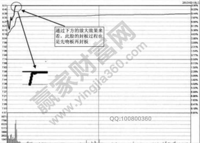 先吻板再封板代表個股沖板時出現了一個小裂口,這個裂口僅出現在第一上沖漲停板時,而且時間極短,場外投資者稍有猶豫,就會錯失追漲買入的機會。結合大量出現了這種分時圖的個股來看,這個小裂口是主力強勢拉升個股時的最后一次輕微洗盤行為或稱為震倉行為。