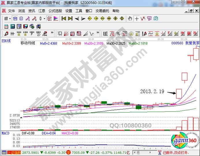 上圖是我愛我家的歷史上走勢圖,從圖中我們可以看到:日K線走勢中,在2013年2月9日的這個跳空使得其突破低位盤整區狀。開盤后,個股流暢上沖漲停板,并且呈現出了這種先吻板在封板的形態(如下圖所示)。